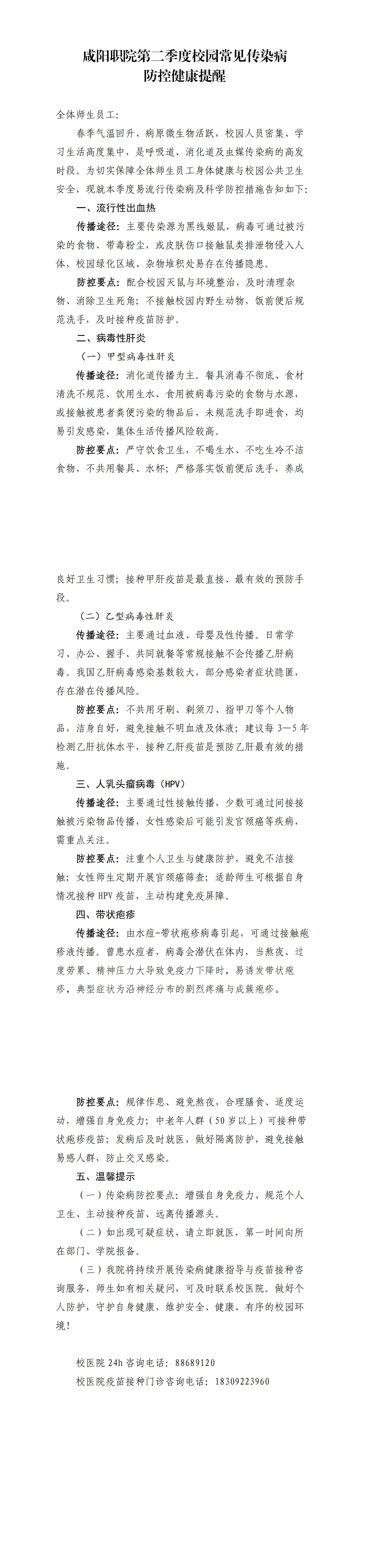 咸阳职院第二季度校园常见传染病防控健康提醒